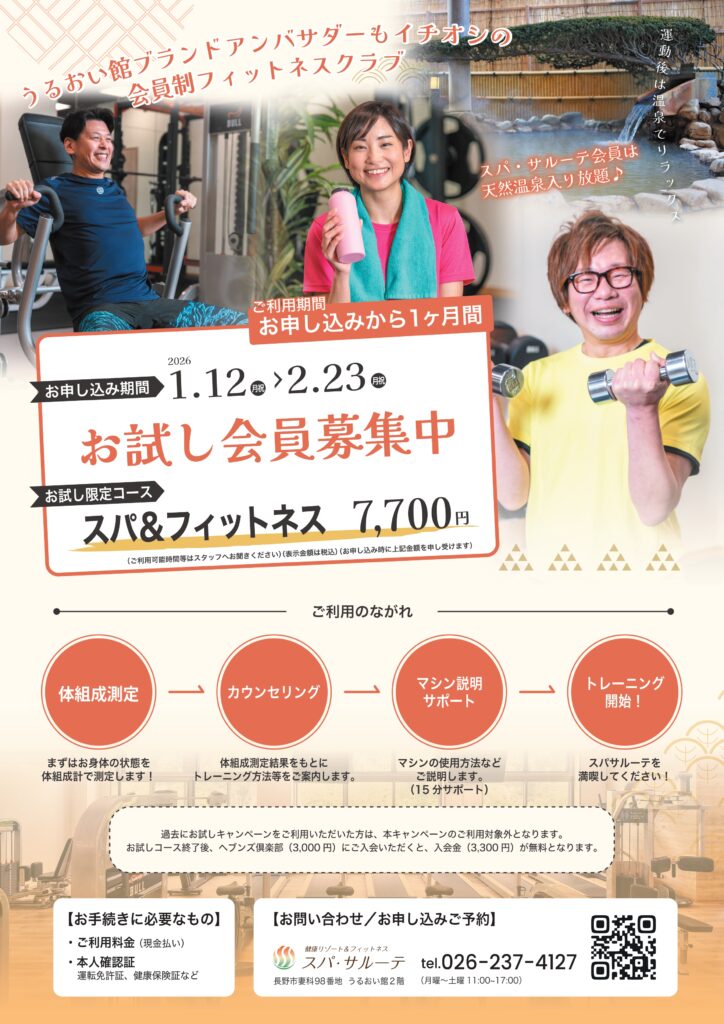 2026新春キャンペーン開催のお知らせです。 1年が始まるこのタイミングは、新しいチャレンジには絶好のチャンス! 期間:2026年1月12日(月)~2月23日(月) 1ヶ月のお試し会員を募集します スパ&フィットネスコース 7,700円(税込) 暖かい室内での運動と、裾花峡を眺めながらの温泉で、心もカラダもリラックス。大人のための運動&リラクゼーション満喫プランです! 詳しくはお問合せください。