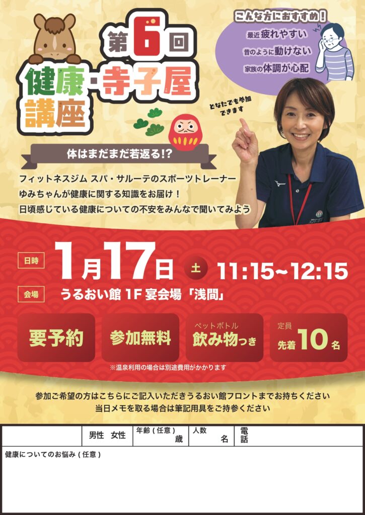 大好評につき、第6回目の開催。今年最後となります。 身体はまだまだ若返る?スパ・サルーテのトレーナーゆみちゃんが、皆様の健康や身体のお悩みにお応えします。 「最近、疲れやすい」「昔のように動けない」「家族の体調が心配」などなど、健康に関する不安などを気軽にお話しください。 寺子屋のような気軽で役立つ60分間。参加無料、ドリンク付きです。ご入浴の前後にぜひご参加を! 【概要】 日時 1月17日(土)11:15~12:15 会場 うるおい館 1階 浅間 参加無料 ペットボトル付 定員 先着10名様 事前予約制 ※どなたでもご参加可能です うるおい館フロントへお申し込みください。 ※温泉入浴される方は別途費用がかかります ※メモを取る方は筆記用具をご持参ください
