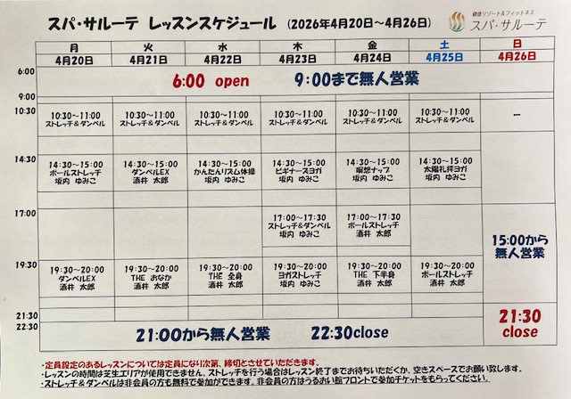 レッスンスケジュールのお知らせ4/20~